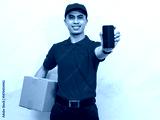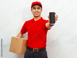 Smiling male courier in a red uniform and cap holding a package box and showing a blank smartphone screen with a friendly, confident expression on a white background.
