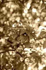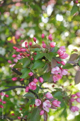 Apple tree branch with pink flowers in full bloom, with defocused background.