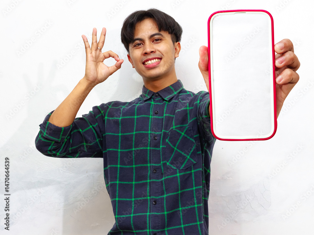 Portrait of a happy young Asian man holding a smartphone with a blank screen, giving a thumbs-up and making an OK gesture, isolated on a white background.