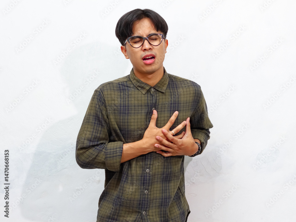 Young Asian man holding his left chest with a pained, sad expression, isolated on a white background.