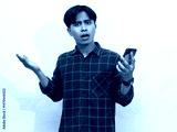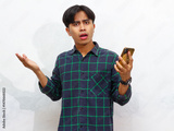 A confused and shocked young handsome Asian man holding a smartphone and looking at the camera with a surprised expression. Isolated on a white background, perfect for advertising purposes.