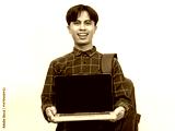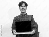 Smiling confident Asian male student holding a backpack and showing a blank laptop screen, isolated on a white background. Perfect for advertising.