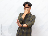 Young handsome Asian man covering his nose with his hand while showing a stop gesture with his hand, isolated on a white background.