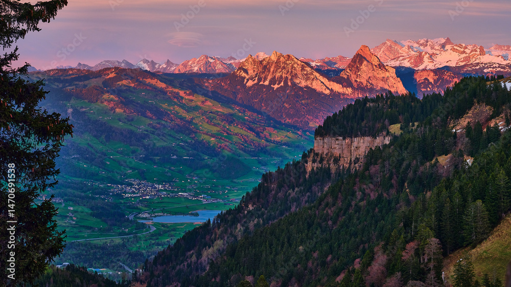 Majestic mountain landscape with vibrant sunset hues over the valley and peaks in Switzerland during early evening