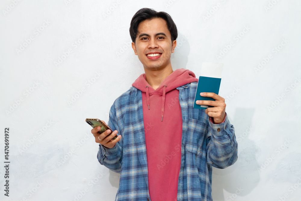 Happy young Asian man looking at smartphone while holding passport. Excited expression, modern travel concept.