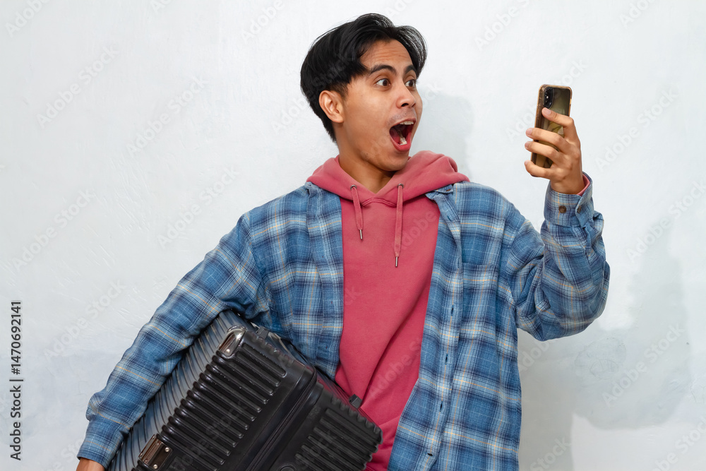 Excited Asian male traveler holding a suitcase, amazed while looking at a smartphone. Capturing the excitement of a trip with modern tech. Perfect for travel and advertising themes.