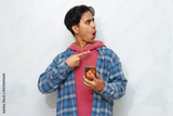 Young Asian man pointing to the side with a funny shocked expression while holding a smartphone. Perfect for advertising, social media, and communication concepts.
