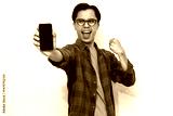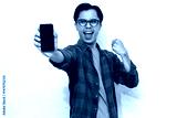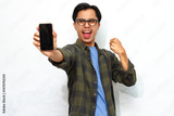 Happy Asian man showing blank phone screen, celebrating success. Isolated for business, tech or app promo on white background