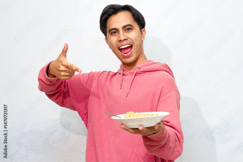 Happy young Asian man in a pink hoodie holding a plate of instant noodles, isolated on a white background.