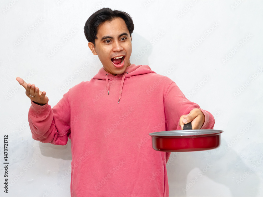 Young Asian man in a pink hoodie looking amazed at an empty frying pan, isolated on a white background.