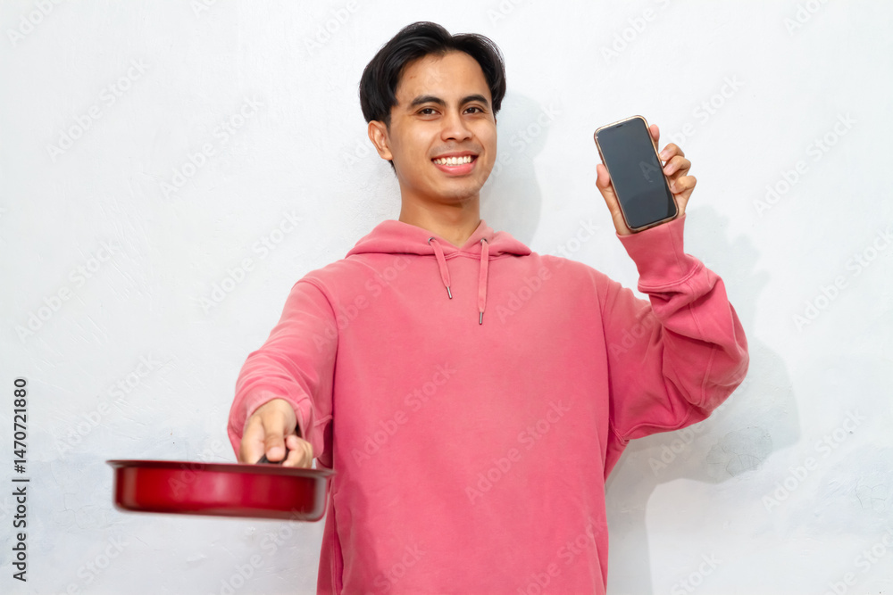Happy young Asian man in pink hoodie showing blank smartphone screen while holding red frying pan, isolated on white background.