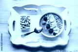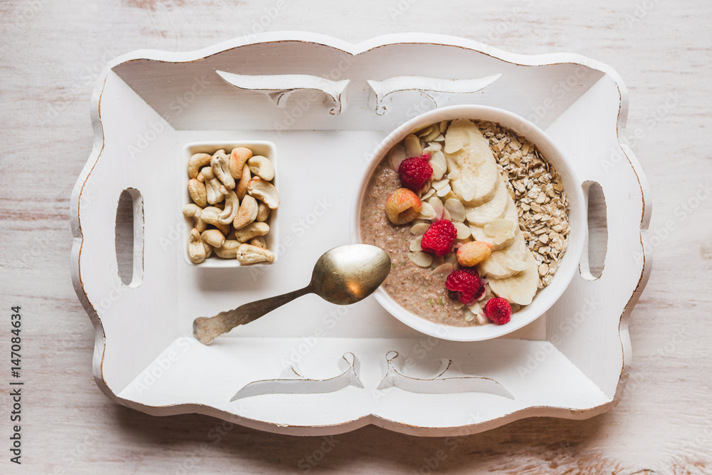 Healthy breakfast with granola, berries, nuts and smoothie. Isolated on white textured wooden background