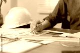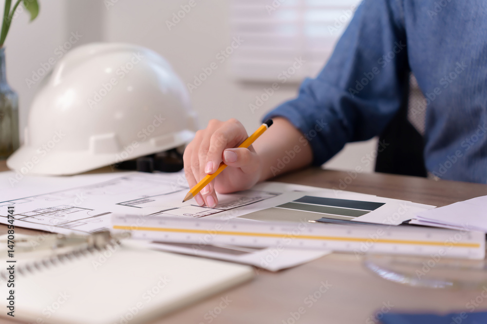 Architect Hand Drawing Blueprint for Construction Plan Idea Asian Adult Woman with Pencil and Ruler to Design House Plans with Hard Hat