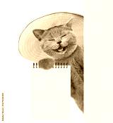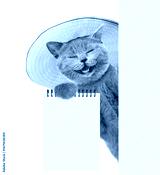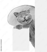 Happy cat wearing summer hat looks from behind blank white board and showing blank notepad. isolated on white background. Empty space for text
