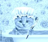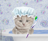 Cute kitten wearing shower cap takes the bath at home, holds toothbrush and shows thumbs up gesture