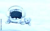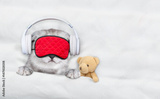 Cute kitten wearing headphones and mask for sleep listening music with toy bear on a bed at home. Top down view. Empty space for text