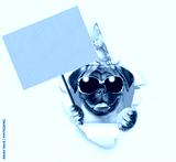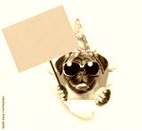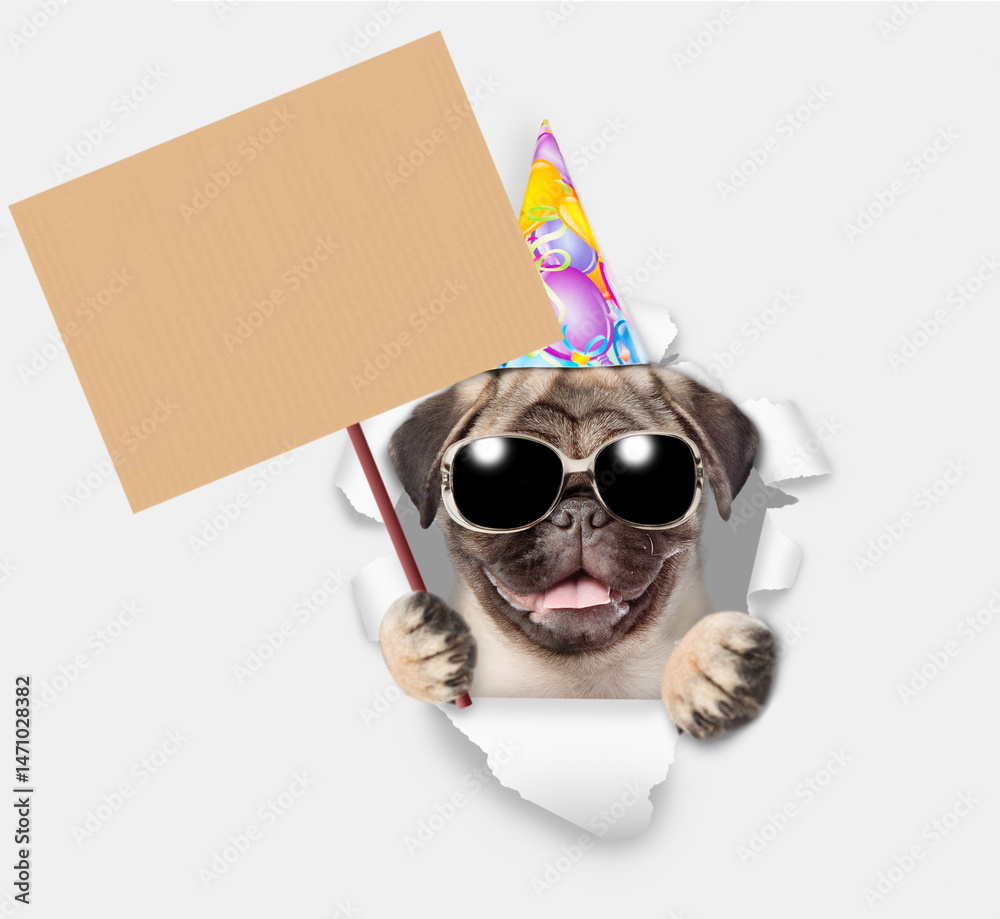 Happy Pug puppy wearing sunglasses and party cap and looking through a hole in white paper and shows blank placard