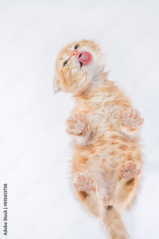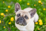 French bulldog puppy sitting on green summer grass with dandelions and looking up at camera. Top down view