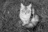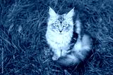 Adult maine coon cat sitting on green summer grass and looking up at camera. Top down view. Empty space for text