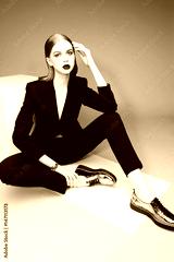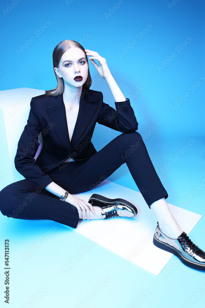 High fashion portrait of young elegant woman in black suit and loafers.