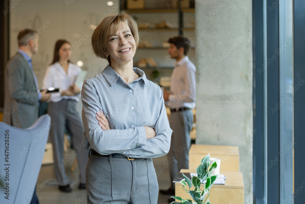 Confident stylish european woman standing at workplace, executive leader manager looking at camera. Colleagues on the background