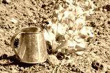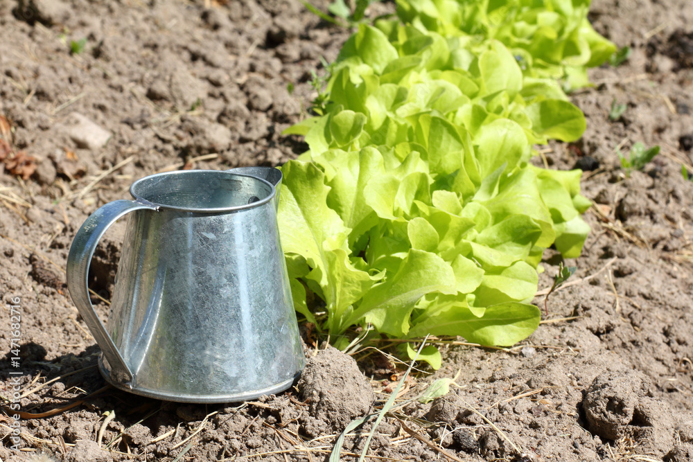 small watering can on the background of green lettuce leaves. fresh vitamin garden bed