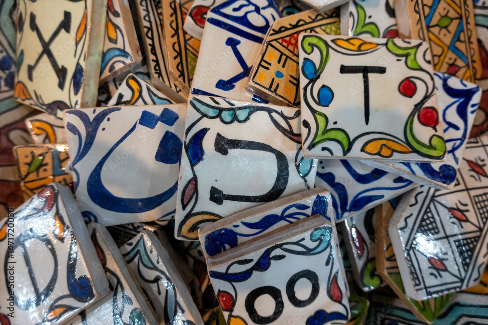 Traditional Moroccan ceramics crafted in an artisanal workshop in Fez. Various colorful, intricately designed pottery pieces highlight Morocco’s rich heritage and skilled craftsmanship.