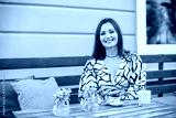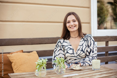 Portrait of attractive young woman in summer cafe in modern city, close-up, copy space