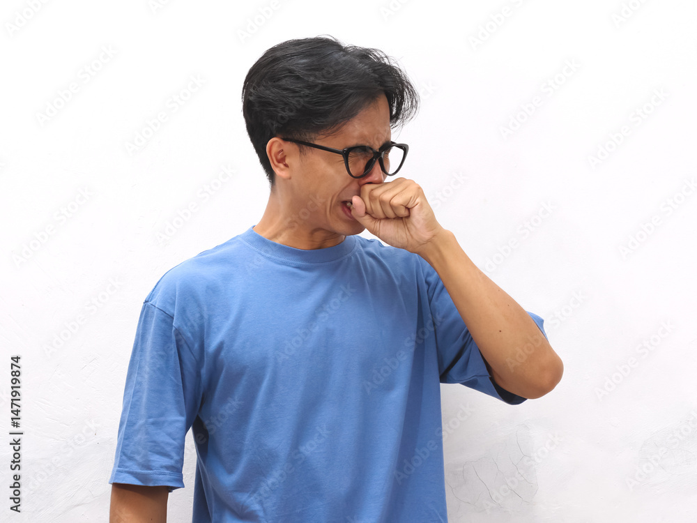 Unhealthy young Asian man with a sad expression coughing and feeling unwell isolated on a white background.