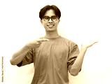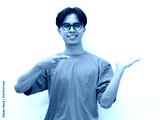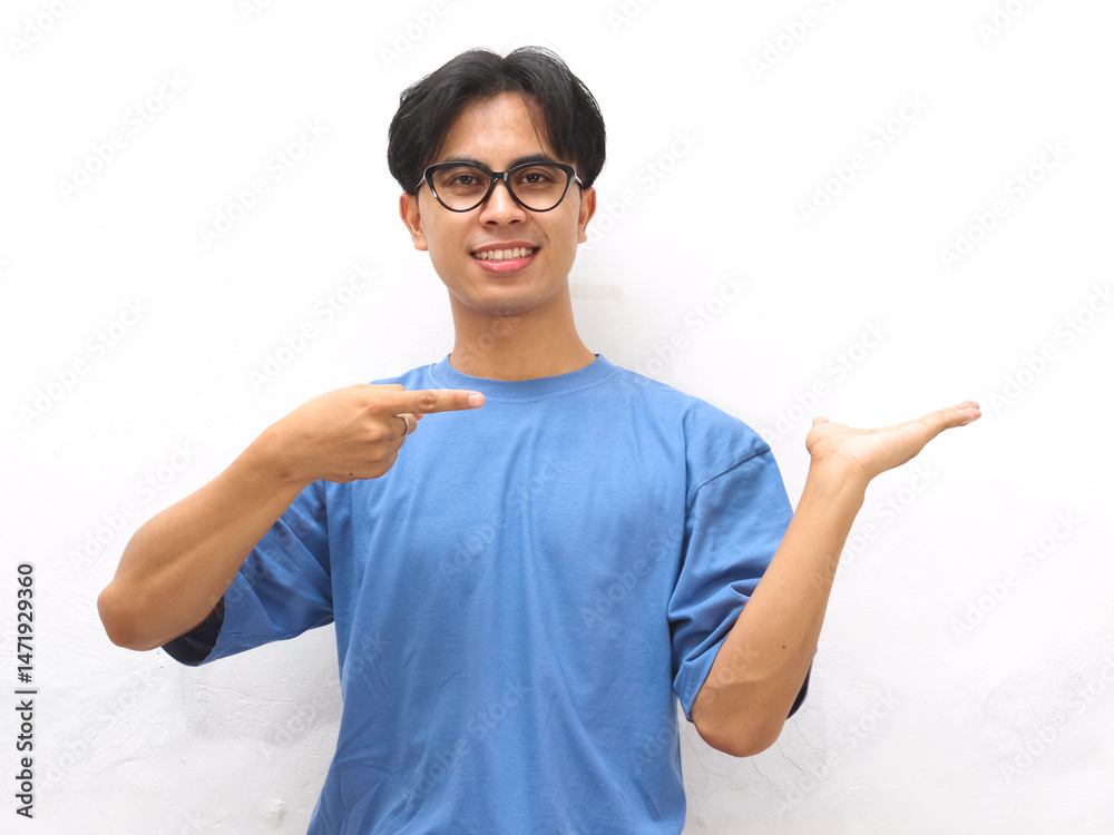 Excited young Asian man wearing blue t-shirt pointing and showing open palm to present product isolated on white background. ideal for product promotion and advertising.