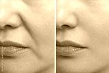 Female nasolabial fold before and after wrinkle smoothing procedures. Correction of the chin and neck shape.