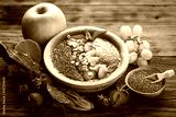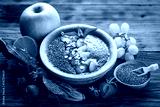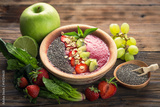 Berry fruit smoothie in the bowl with fruits and seeds
