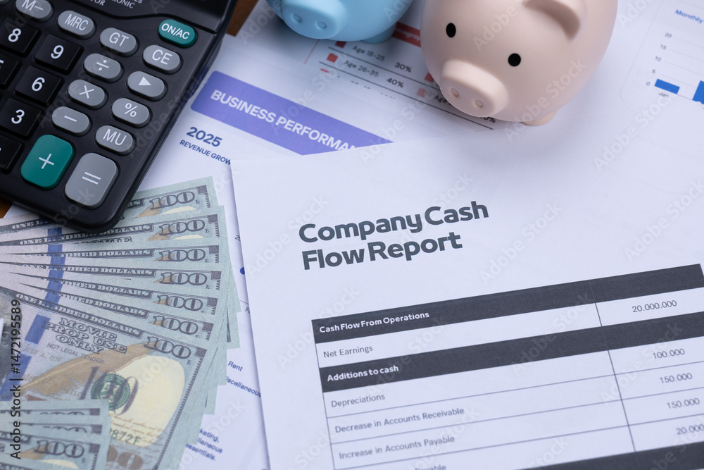 A Company Cash Flow Report with cash, a calculator, and piggy banks on a desk, representing business financial management and analysis.