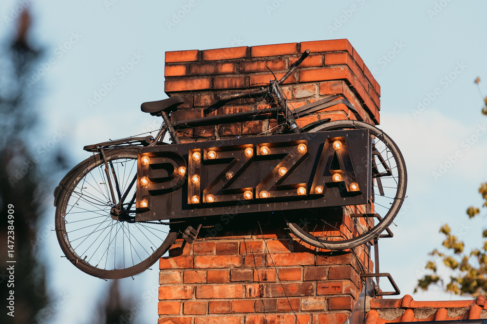 A retro-style pizza sign made of marquee lights is mounted on a brick wall, creatively integrated with an old bicycle.