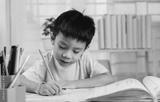 Cute 6-8 year old school boy doing homework at home on weekends. Writing homework diligently with a pencil. Very happy doing homework. Home learning. Online learning.
