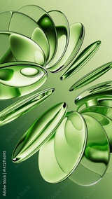 A 3d rendering. Round green glass shapes. Abstract aesthetic background, modern vertical wallpaper