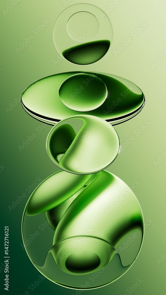 A 3d rendering. Round green glass shapes. Abstract aesthetic background, modern vertical wallpaper