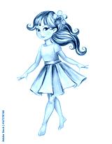 watercolor illustration, cute little girl in blue skirt walking, bare feet, dancing, child, doll, clip art isolated on white background