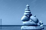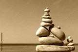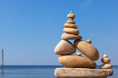 Rock zen pyramid of yellow stones on the beach against the background of the sea and blue sky. Concept of Life balance