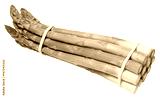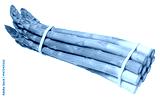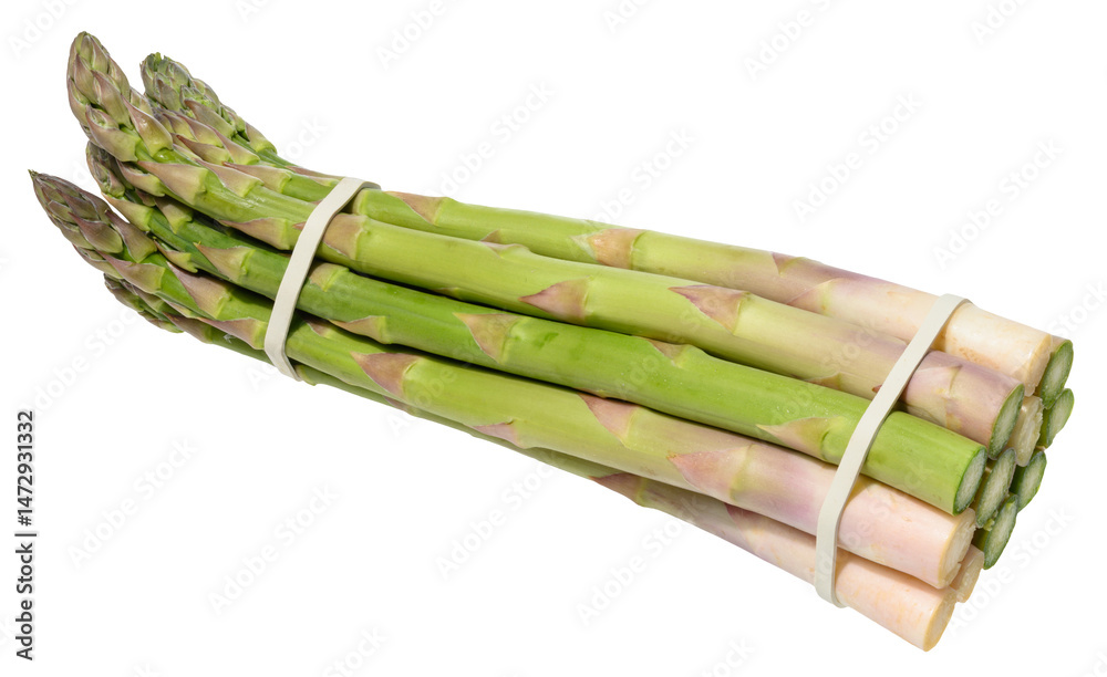 Fresh green asparagus bundle tied with rubber band, isolated on white background. Healthy and delicious vegetable close-up
