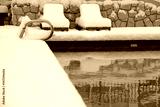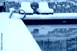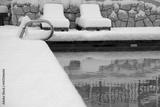An outdoor swimming pool. the area around it and the lounging chairs covered in over half a foot, 20cm, of snow.