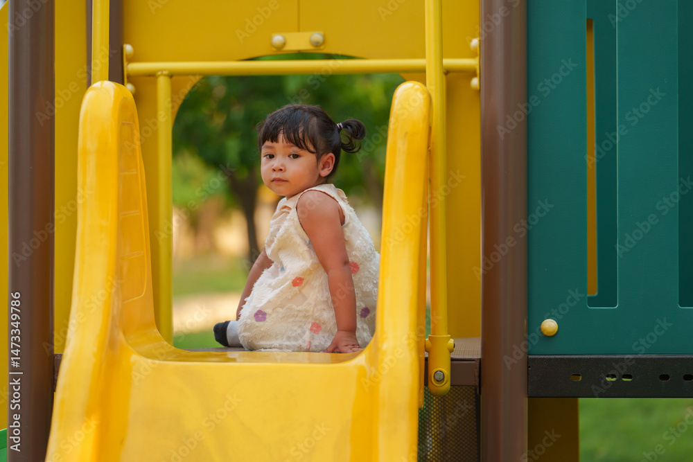 happy toddler baby girl playing at outdoor playground in park