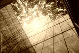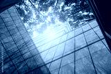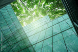 Eco-friendly building in modern city. Sustainable glass office building with trees for reducing carbon dioxide. Office building with green environment. Corporate building reduce CO2. Net zero emission