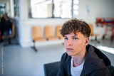 Teenage boy waiting alone in hospital waiting area before medical checkup.