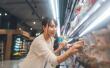 Asian woman customer choosing fresh milk dairy products beverages shelf food shopping at supermarket