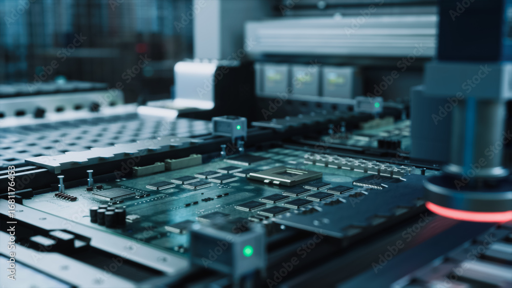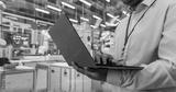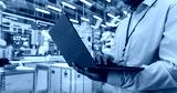 Close Up of an Anonymous Engineer Using a Laptop Computer to Monitor Robotic Arms in an Advanced Industrial Factory. Specialist Overlooking Modern Automated Electronics Manufacturing