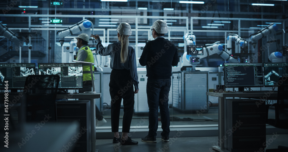 Male Engineer and Female Project Manager Standing Next to an Assembly Line, Talking, Using Laptop and Monitoring Production at a Modern Automated Electronics Manufacture with Robotic Arms. Back View