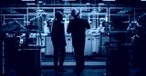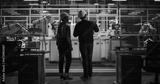 Female and Male Industrial Engineers Having a Conversation at a Modern Tech Electronics Factory with Automated Robot Arms Working with the Help of Artificial Intelligence Software. Back View