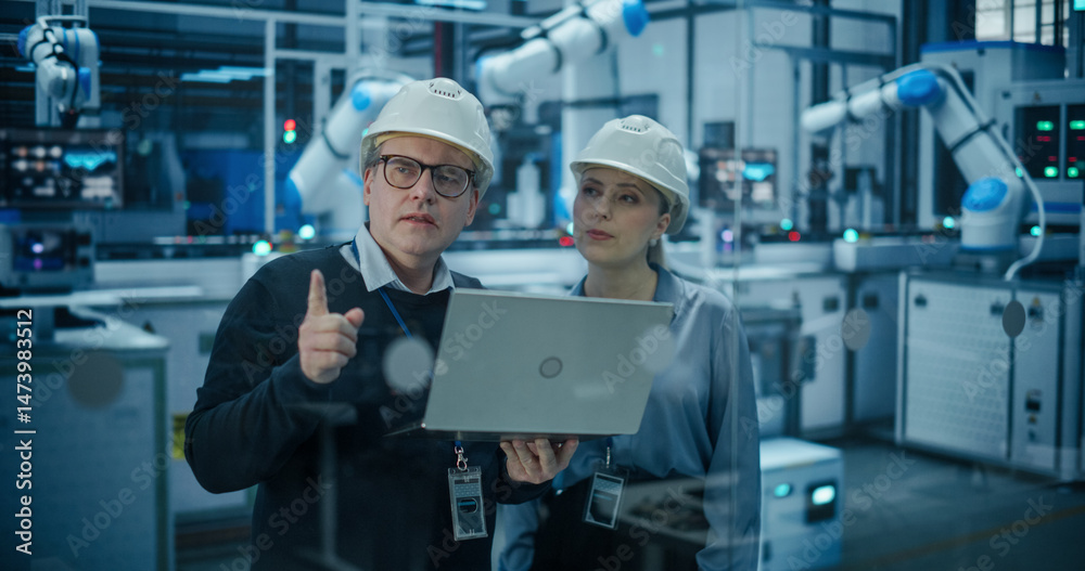 Female and Male Industrial Engineers Standing Next to Assembly Line, Having a Conversation at an Electronics Factory with Automated Robot Arms Working with the Help of Artificial Intelligence Software