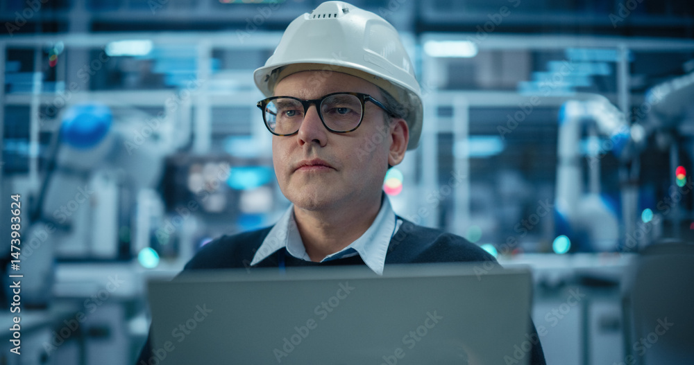 Adult Caucasian Engineer in a Hard Hat Working in a Modern Industrial Facility, Using Laptop Computer to Monitor Robotic Arms in a Futuristic Electronics Manufacturing Factory